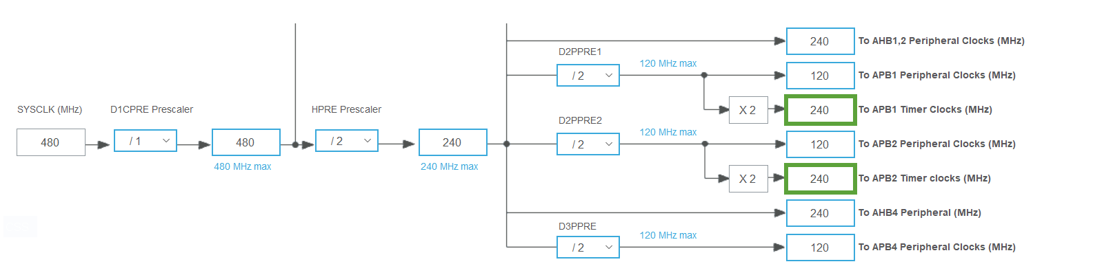 The CLK signal is derived from the APB1 and APB2 Timer Clocks, each running at 240MHz.