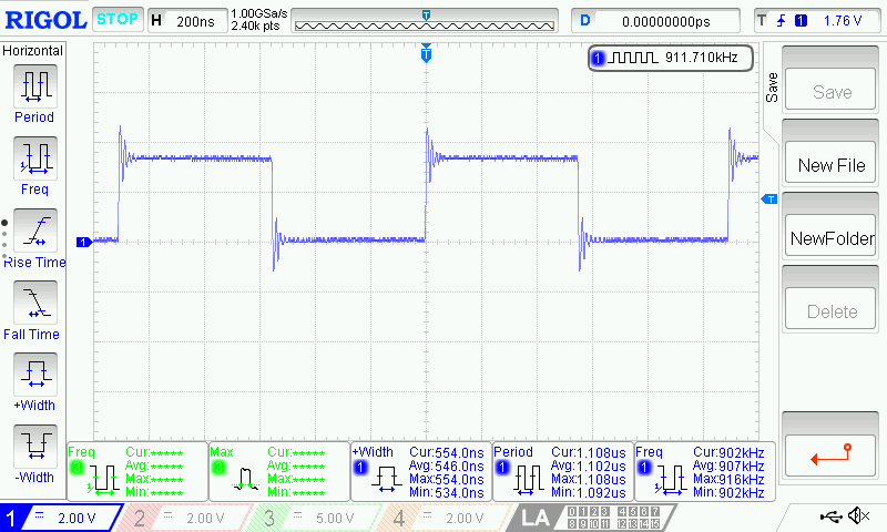 The following figure shows the resulting waveform for a set delay of \(1\text{ns}\), followed by a summary table with measurement results for various delays.
