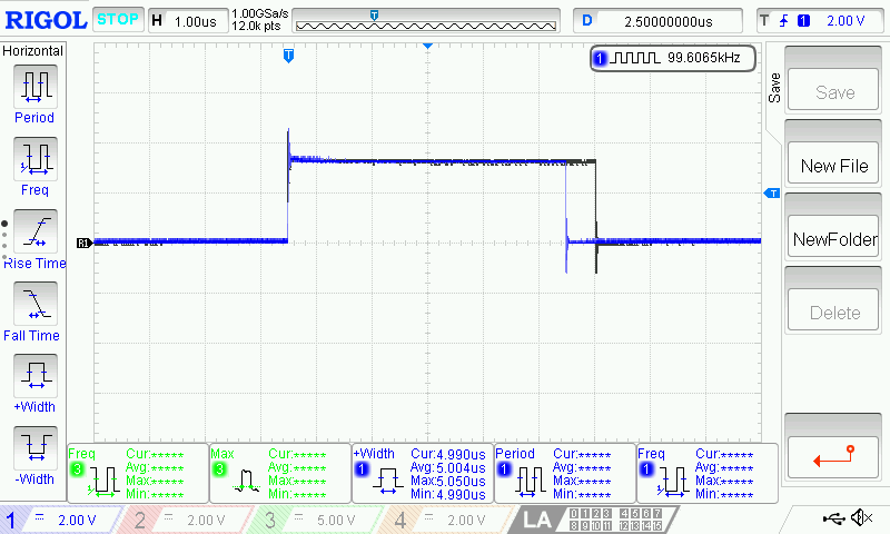 and is automatically subtracted from the requested nanosecond delay. The figure below shows a requested delay of \(5000\text{ns}\): without compensation (black) and with compensation (blue). While compensation is applied, the delay averages ~\(5004\text{ns}\).